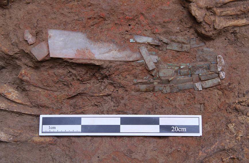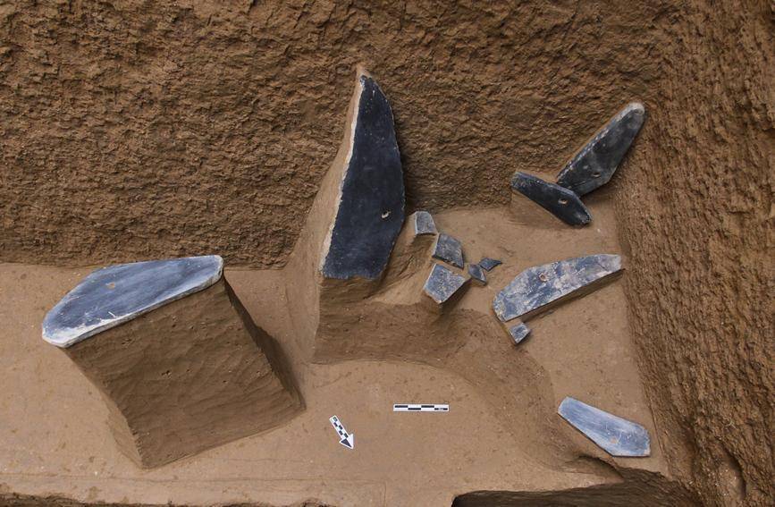 M2墓葬石磬出土情况。陕西省考古研究院供图